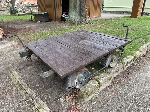 Kolejový dřevěný ruční vozík vystavený v železničním muzeu v Zubrnicích.